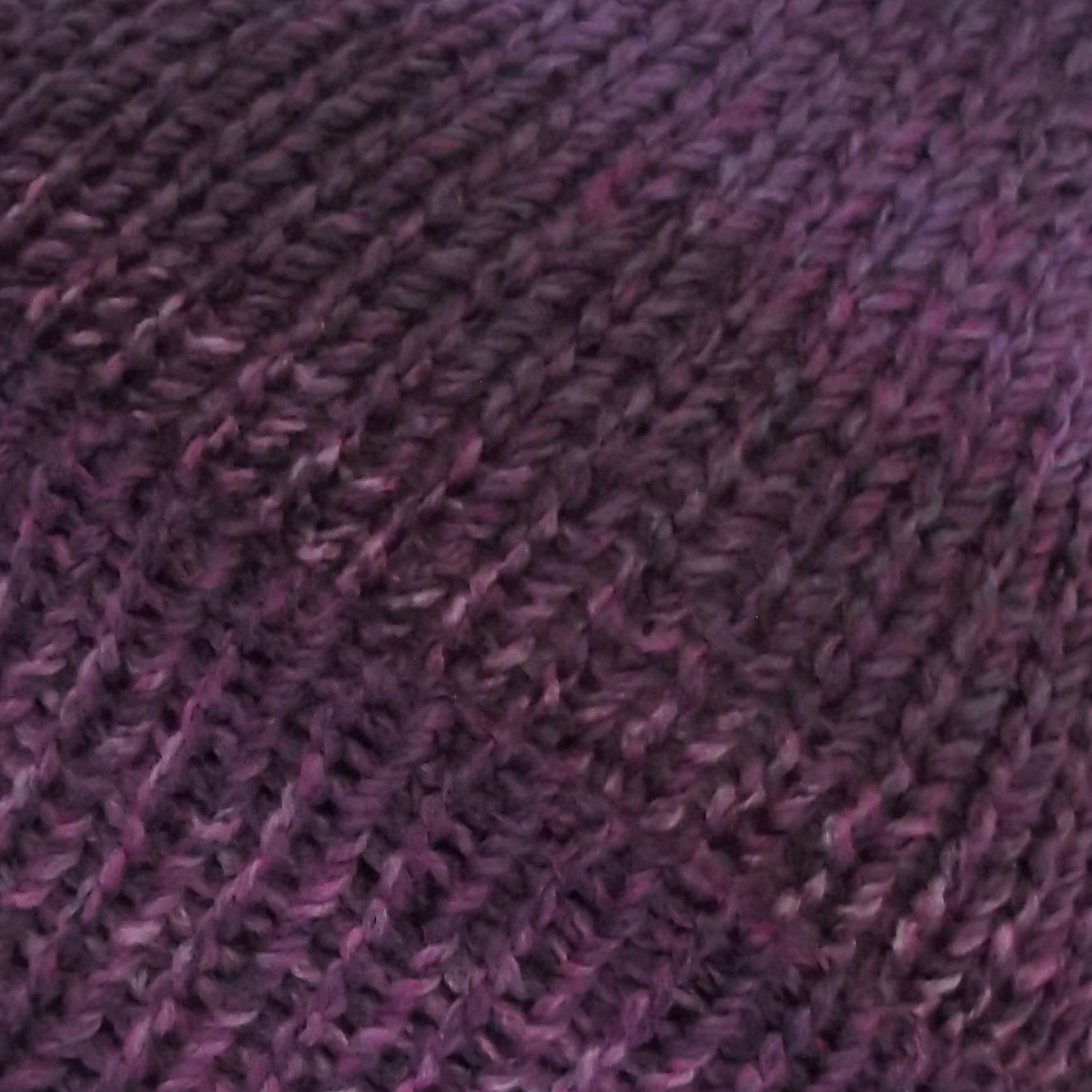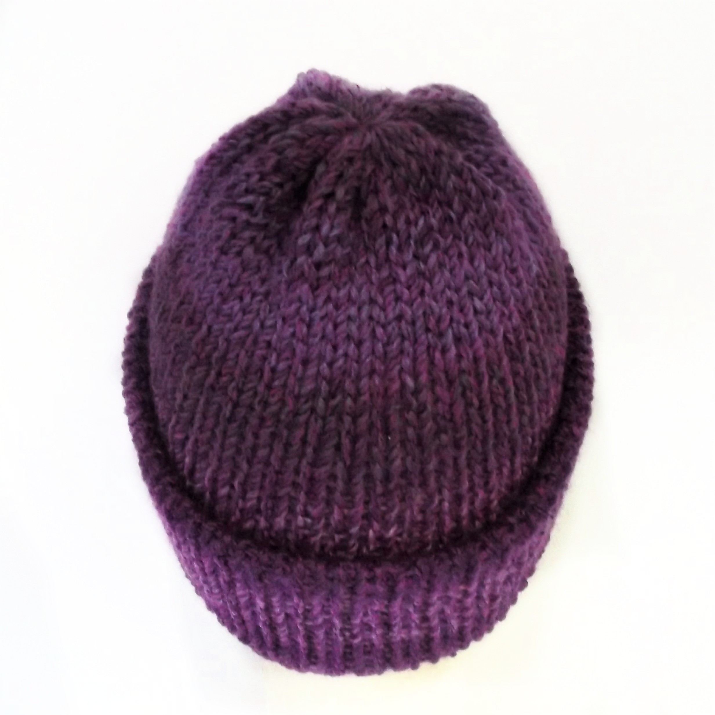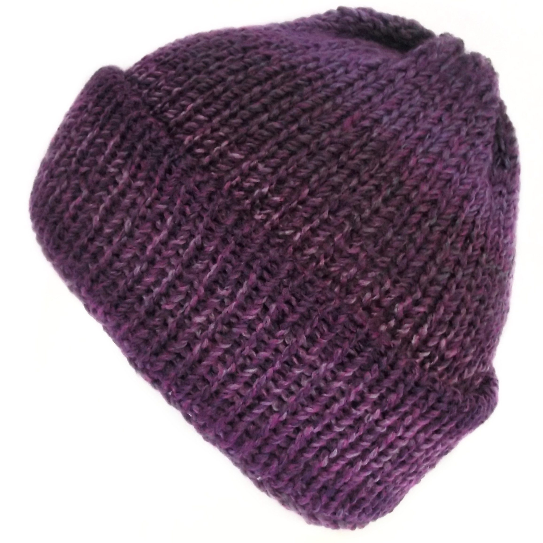 Purple fisherman beanie hat with brim. The wool is marbled so the colours are spread randomly throughout, making each hat unique.