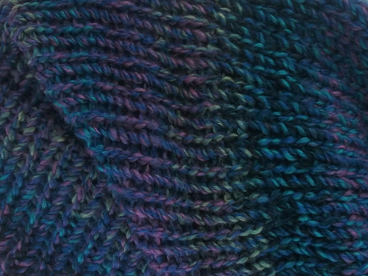 The Indigo and green chunky slouchy beanie hat. Hand-woven on a mechanical loom with chunky wool. The colours are spread randomly throughout, making each hat very unique.