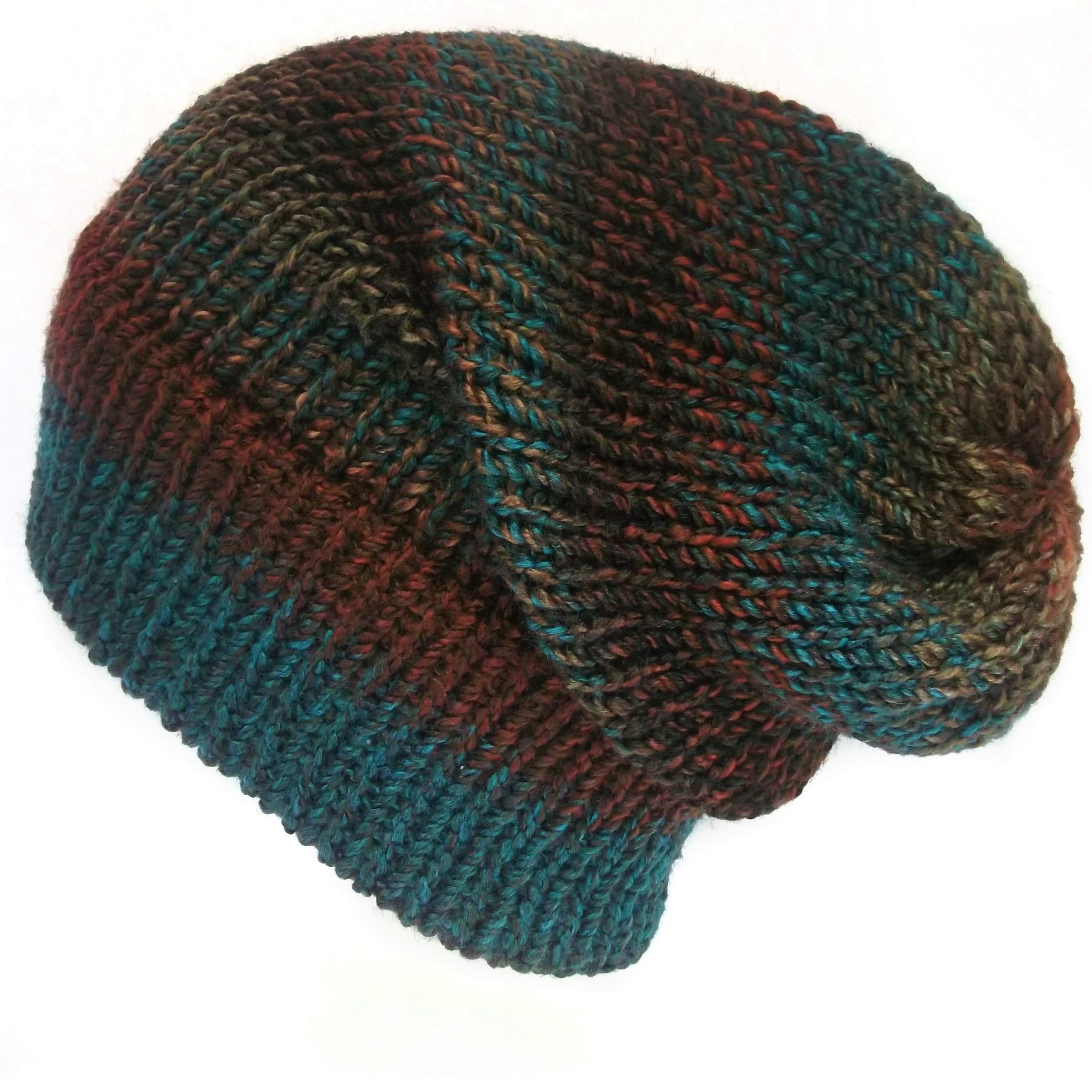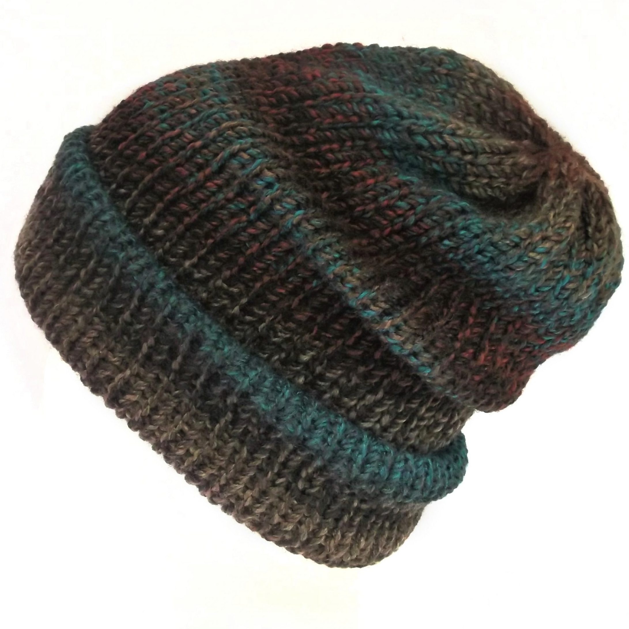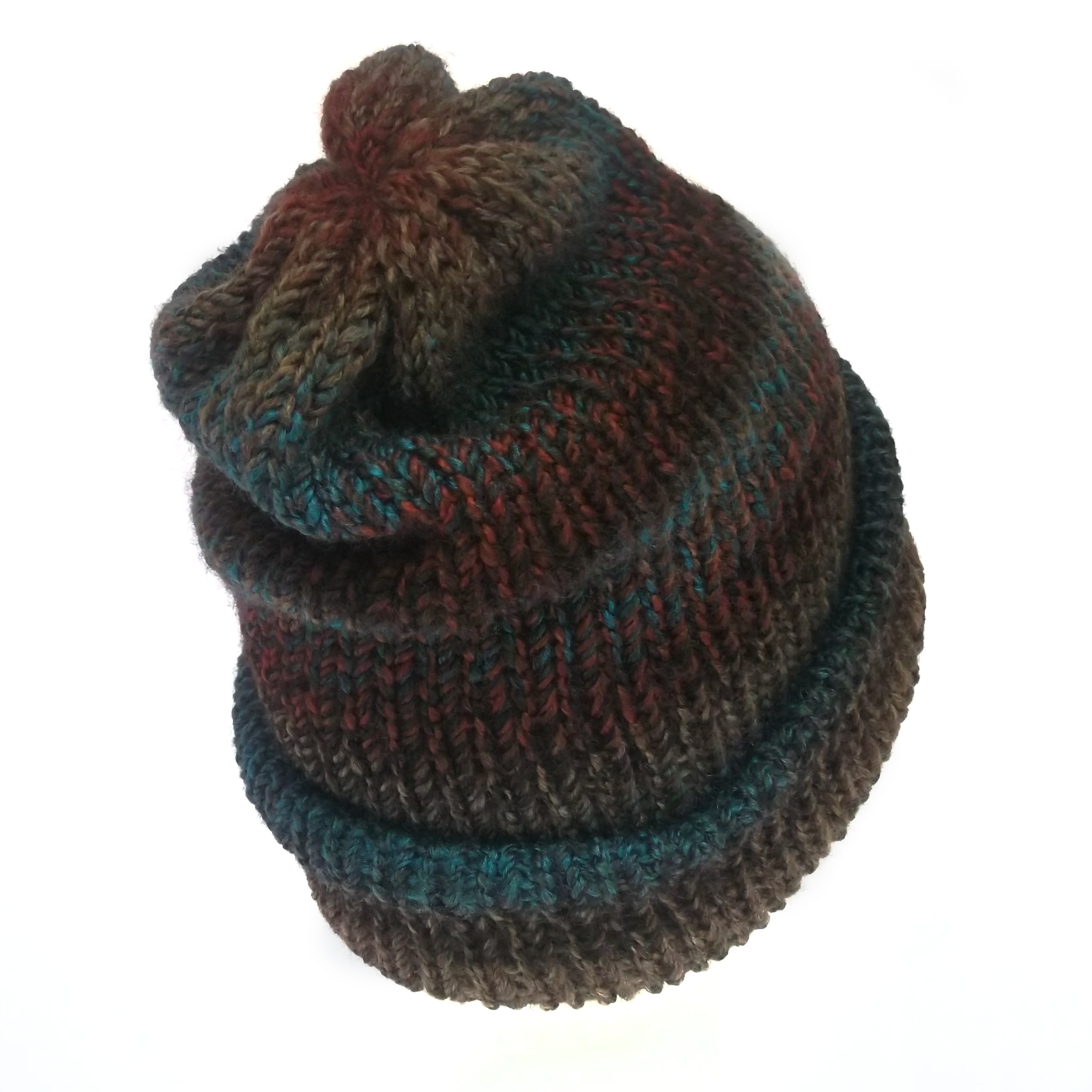 The Kodiak chunky slouchy beanie hat with browns, reds, and a lovely deep blue/teal. Hand-woven on a mechanical loom with chunky wool. The colours are spread randomly throughout, making each hat very unique.