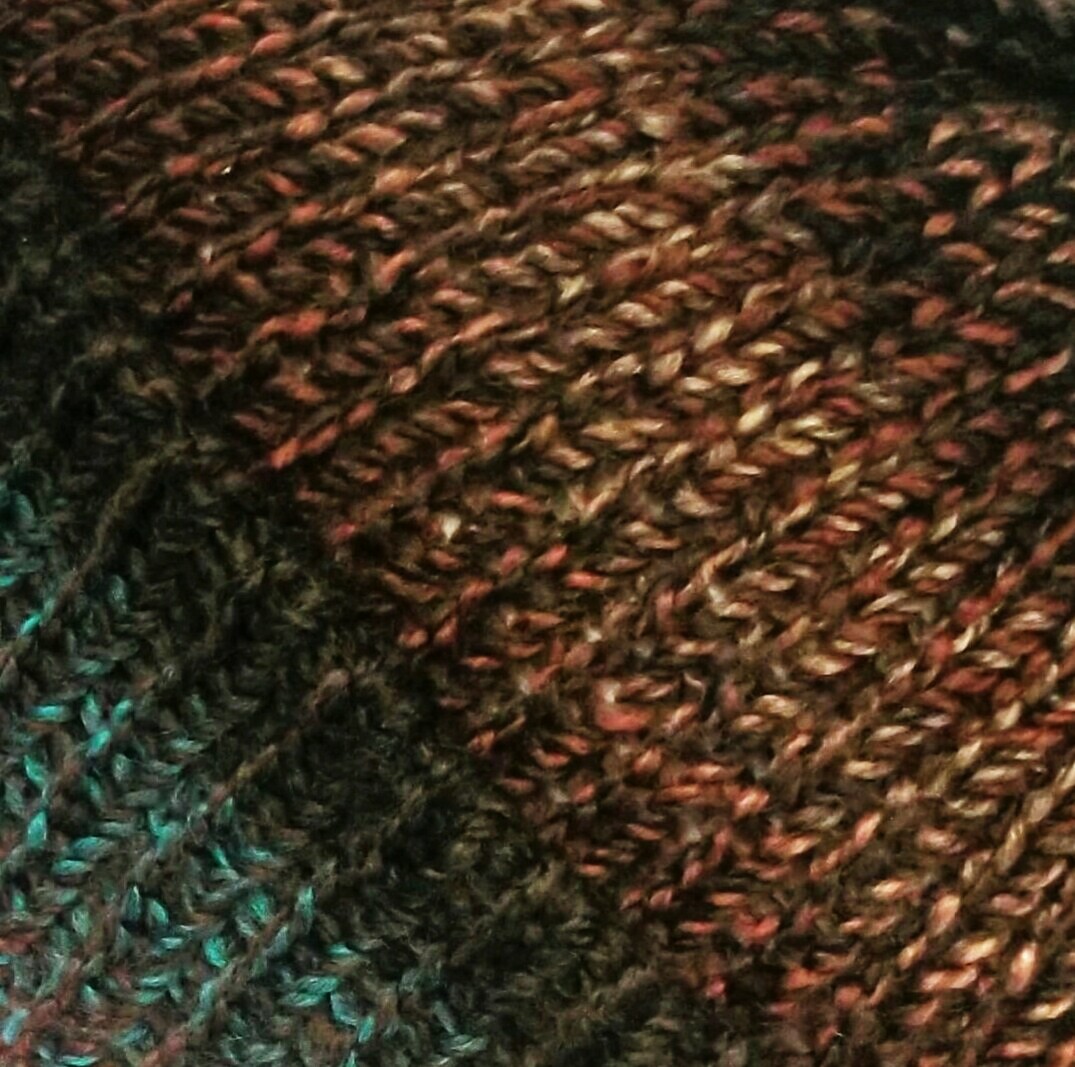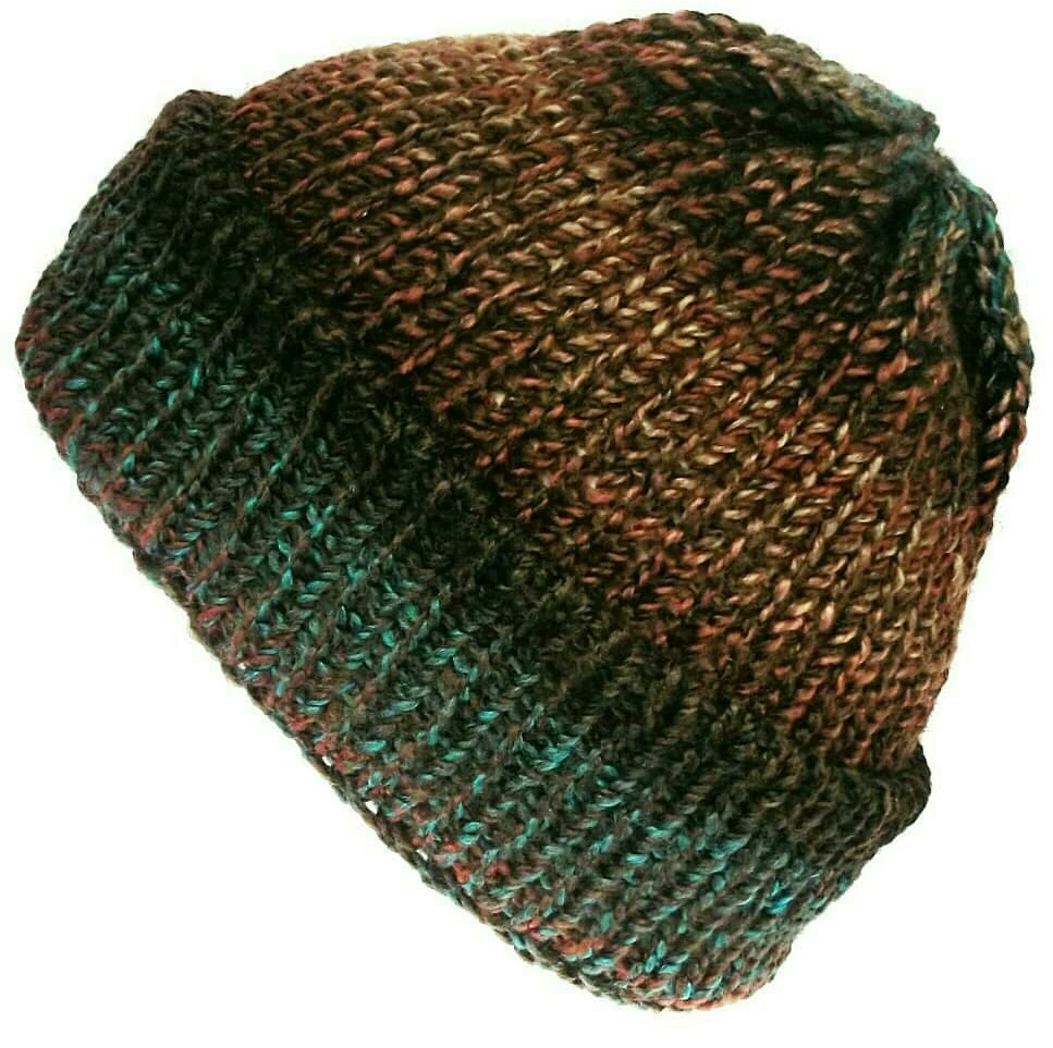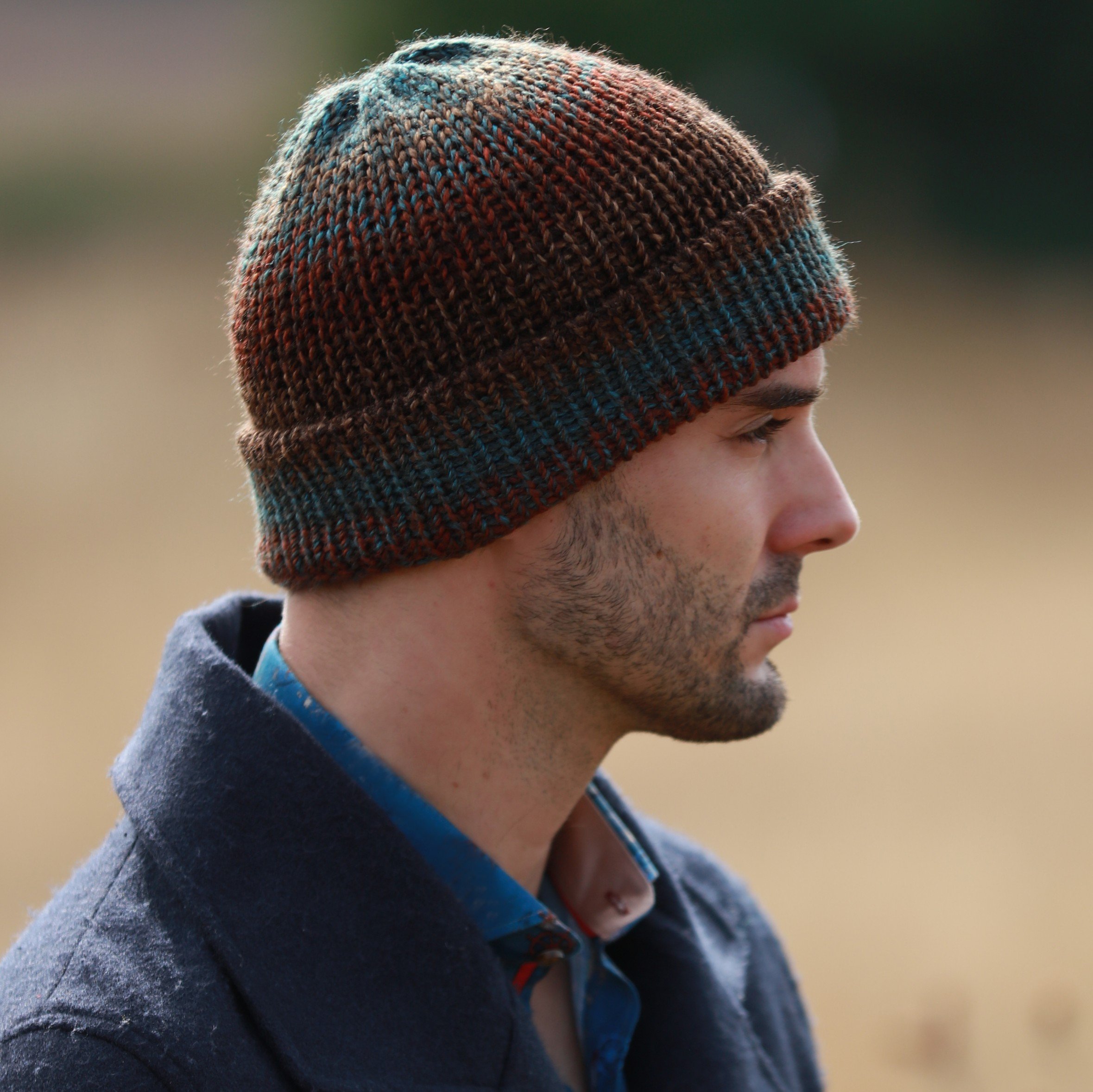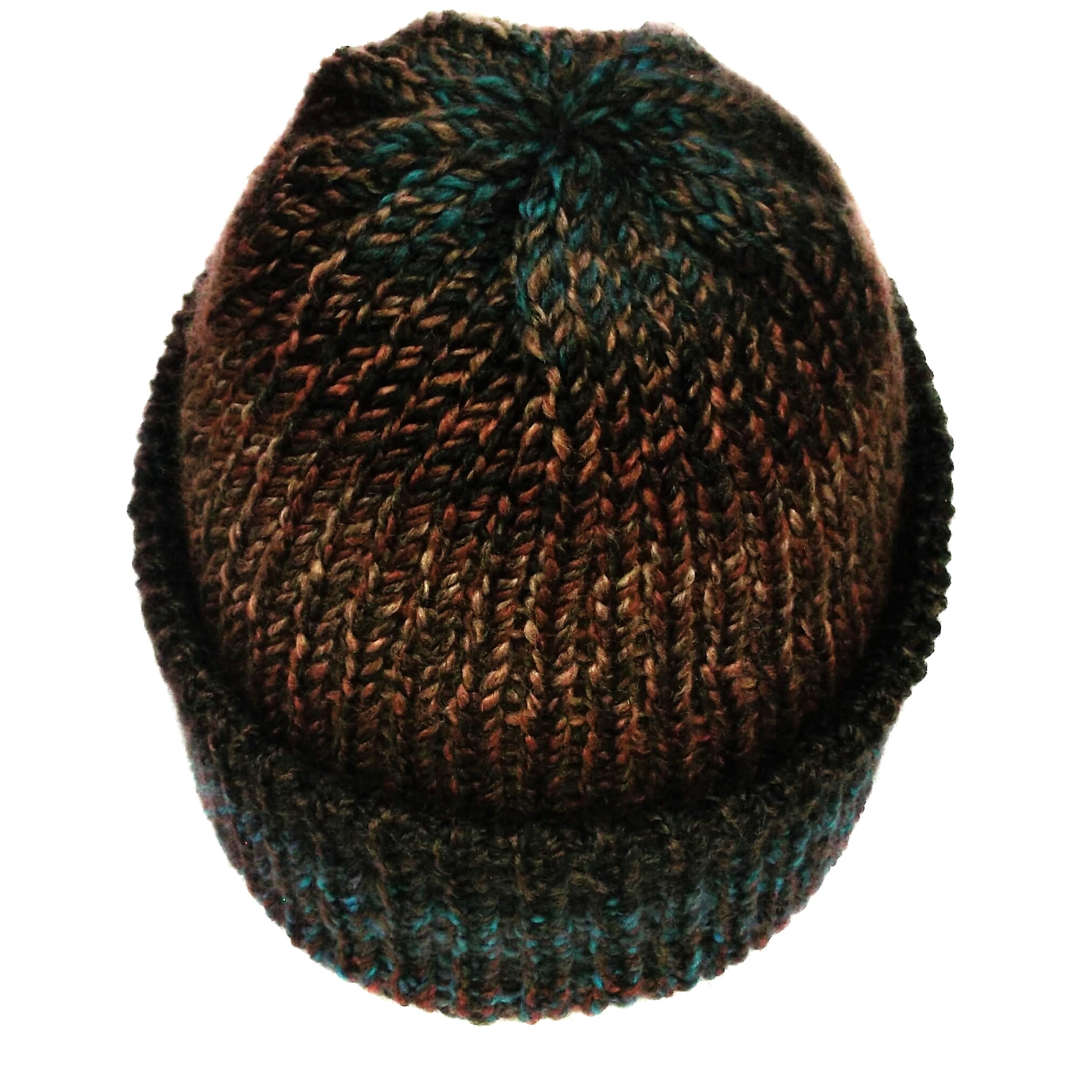 Brown and teal fisherman beanie hat with brim. The wool is marbled so the colours are spread randomly throughout, making each hat unique.