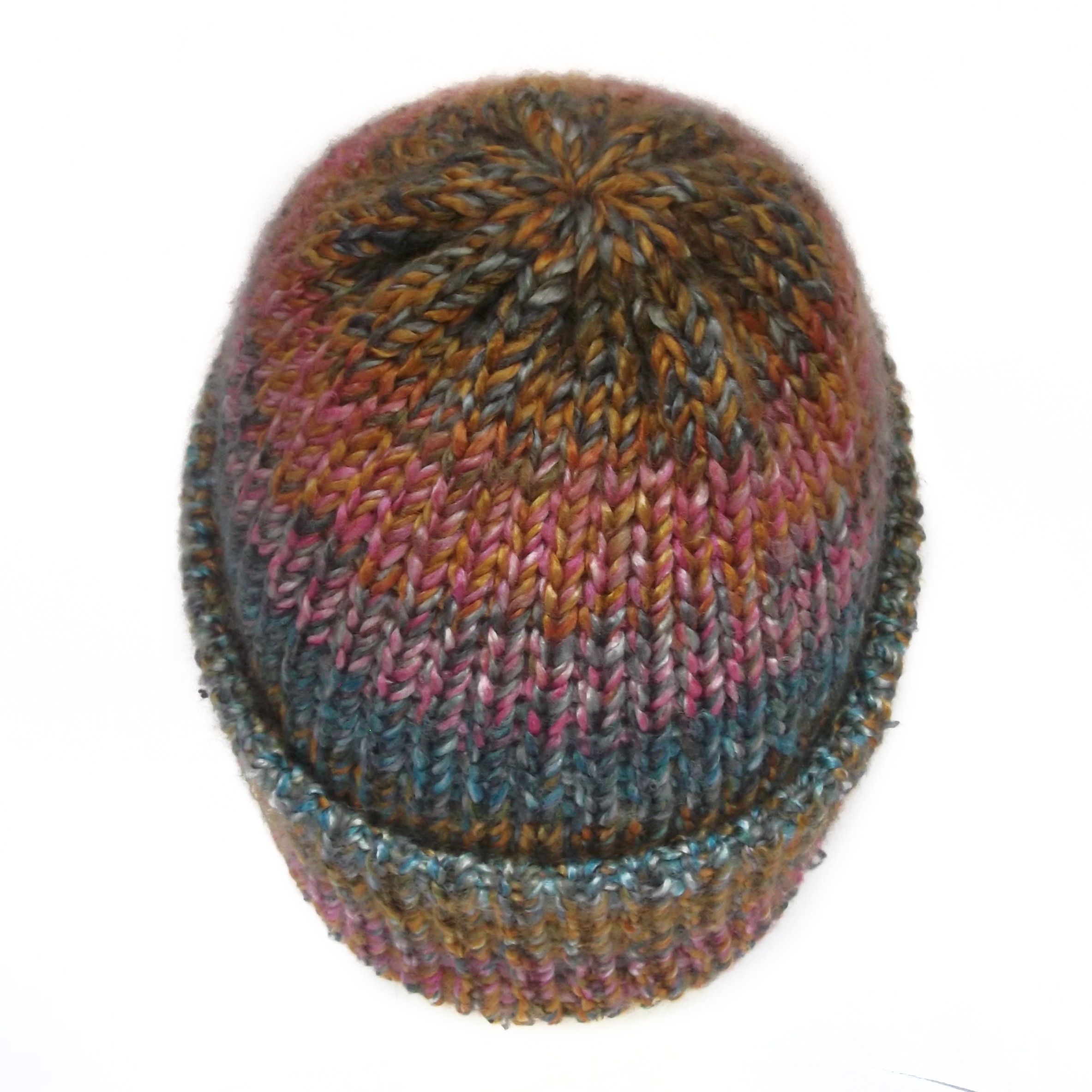 The Pink and orange fisherman beanie hat with brim. Pink, orange with blues, greys and hints of green. The wool is marbled so the colours are spread randomly throughout, making each hat unique.