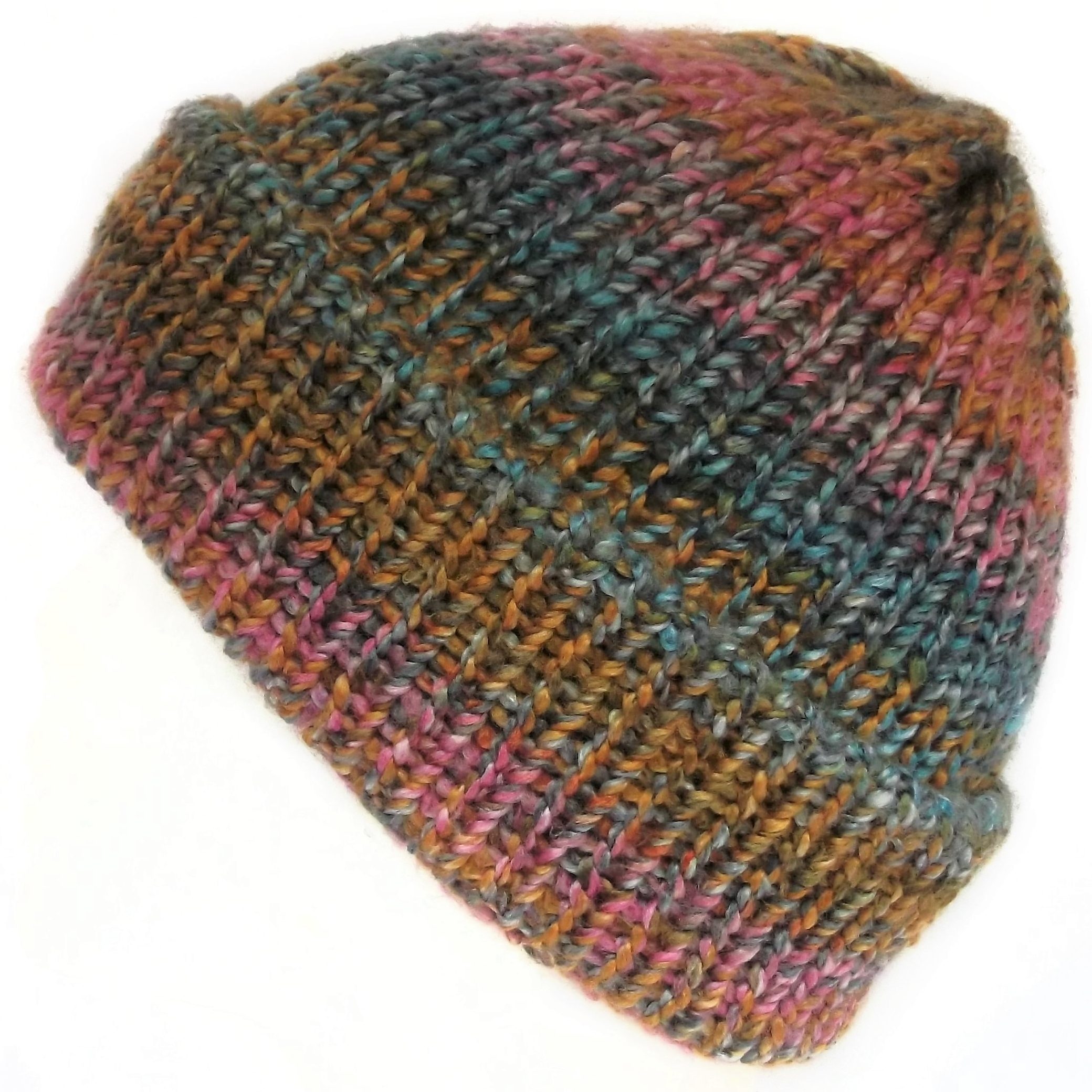 The wool is marbled and the colours are distributed randomly throughout, making each hat unique.